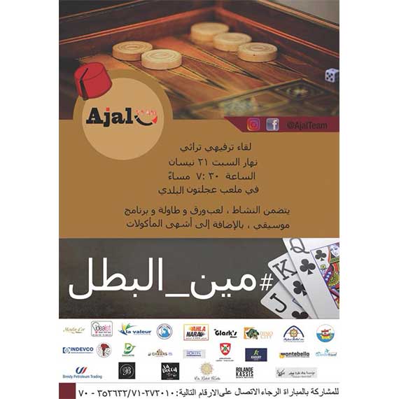 جمع أبناء بلدة عجلتون نهار الأحد الواقع في 22 نيسان 2018 عند الساعة الخامسة بعد الظهر في ملعب عجلتون البلدي وتضمن هذا النشاط لعب ورق وطاولة وبرنامج موسيقي، بالإضافة الى أشهى المأكولات وتم خلال الحفل تقديم الجوائز الى المشاركين الرابحين. |